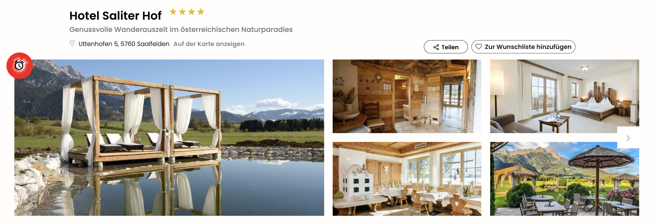 Das 4* Vitalhotel Saliter Hof liegt bei Saalfelden am Steinernen Meer und ist damit wunderschön eingebettet zwischen Berggipfeln. In den Sommermonaten erwarten euch zahlreiche Wanderwege in der Umgebung und bei Schnee lockt das Skigebiet Saalbach-Hinterglemm-Leogang.