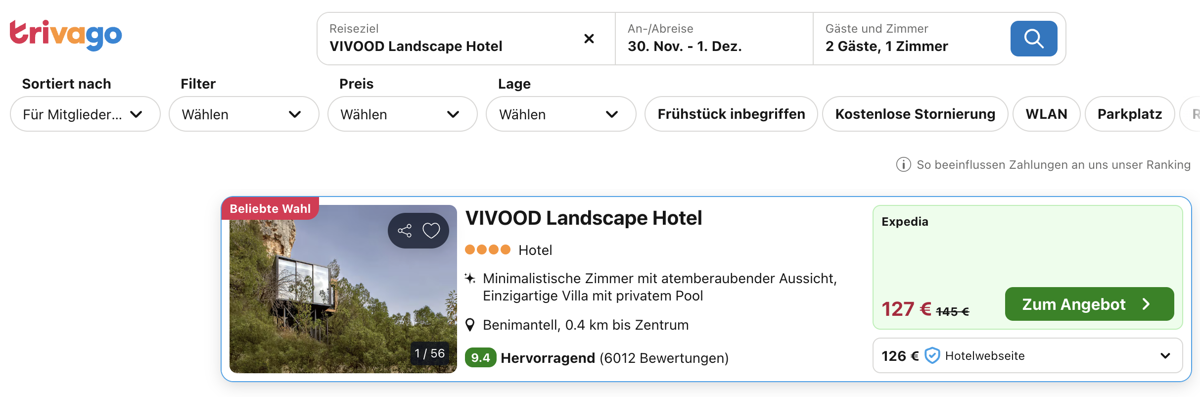 An unserem Beispieltermin konnten wir den günstigsten Preis direkt auf der Hotelwebsite finden. Lasst euch von Trivago also direkt dorthin weiterleiten.