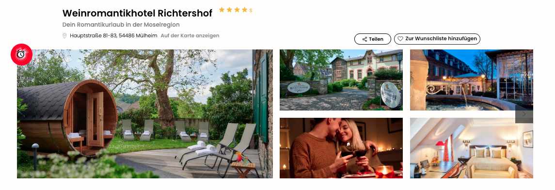 Es geht ins überragend bewertete 4*S Weinromantikhotel Richtershof in Mülheim an der Mosel und der Name ist Programm. Auf dem ehemaligen Weingut aus dem 17. Jahrhundert könnt ihr euch viel Zeit für euch nehmen, im Wellnessbereich entspannen oder den einen oder anderen Tropfen aus dem Weinkeller probieren. Los geht es bereits ab 179€ pro Person für zwei Übernachtungen im Doppelzimmer inklusive täglichem Sekt-Frühstück und 3-Gang-Dinner. Zudem ist noch eine Weinprobe inkludiert. Termine findet ihr bis April.