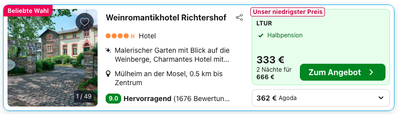 Wir haben verglichen und können euch froh verkünden: Ihr könnt was sparen! Auf anderen Portalen zahlt ihr für zwei Übernachtungen (z.B.: 12. - 14. Dezember) 333€ pro Person, bei Travelcircus hingegen nur 179€ pro Person. Zusätzlich erhaltet ihr noch die Weinprobe geschenkt. Das ergibt eine unglaubliche Ersparnis von mehr als 46%!