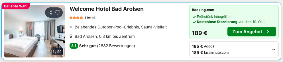 Vom 13. auf 14. Oktober zahlt ihr mit diesem Deal nur 69€ pro Person. Auf anderen Portalen zahlt ihr hingegen schon mal mehr als 92€ pro Person und habt dann nur das Frühstück mit dabei.