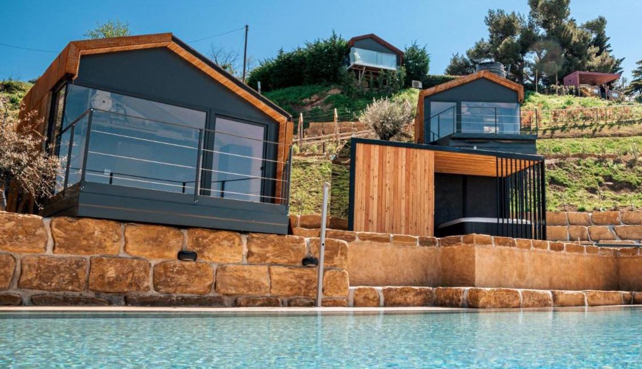 Die Glamping-Villen, die wir euch ier vorstellen möchten, liegen knapp 10 km entfernt vom Meer, sind dafür jedoch umgeben von Weinreben. Beziehen könnt ihr neben einer größeren Villa dort drei verschiedene Tiny Houses, die eine Fläche von ca. 29 qm haben und mit einem Doppelbett sowie einer Küche und einem eigenen Bad ausgestattet sind.