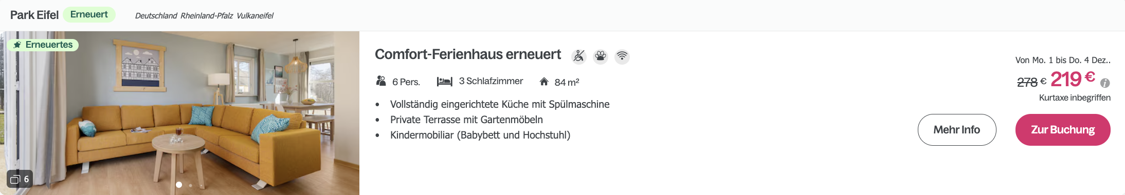 Los geht's bei den Angeboten schon ab 219 € für 3 Nächte und 4 Personen! Das Angebot läuft noch bis zum 28. Oktober 2025 um 0:59 Uhr und gitl für Anreisen bis März 2026.