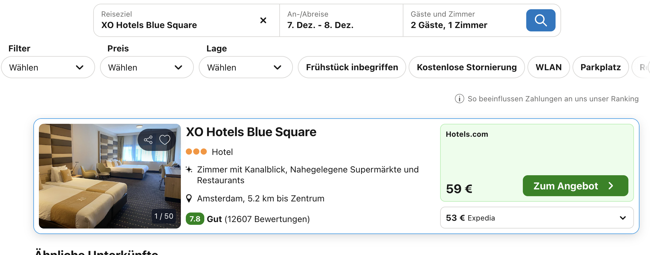 An unserem Beispieltermin konnten wir den günstigsten Preis bei Expedia finden. Lasst euch also dorthin weiterleiten, um lediglich 53 € pro Nacht zu zahlen, also gerade mal knapp 27 € pro Person.