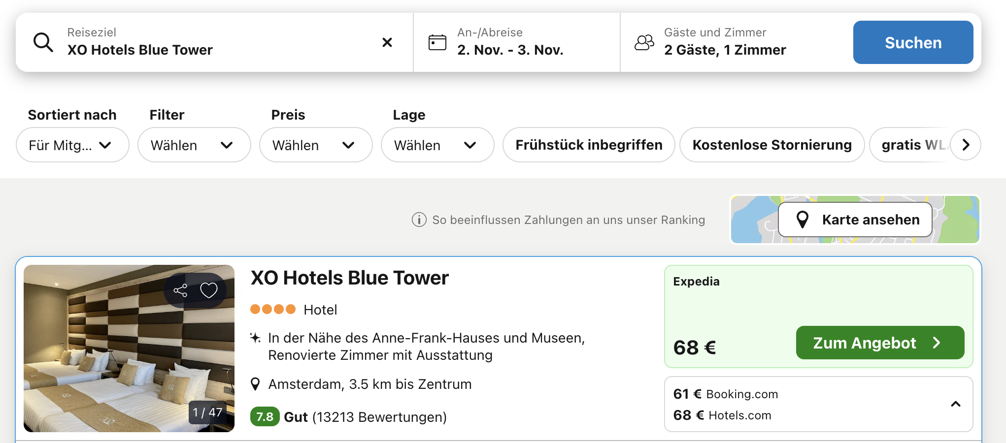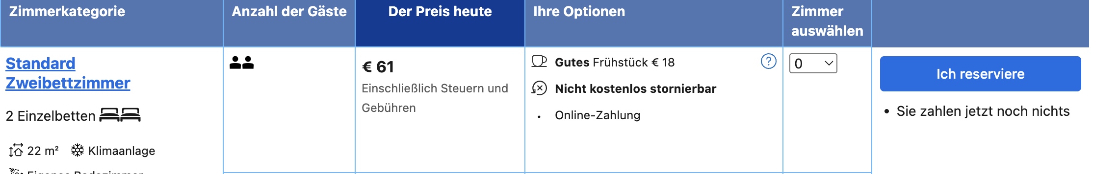 An unserem Beispieltermin konnten wir den günstigsten Preis bei Booking finden. Lasst euch also dorthin weiterleiten, um lediglich 61 € pro Nacht zu zahlen.