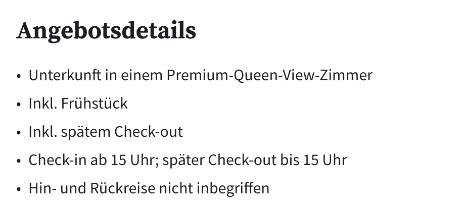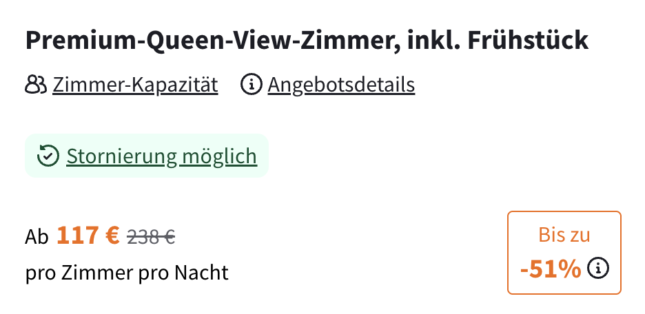 Termine gibt es schon für 49,50€ pro Person. Ihr bekommt das Upgrade auf ein Premium-Queen-View-Zimmer, Frühstück und den Late Check-Out dazu.