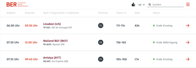 Screenshot von der Abflugtafel: