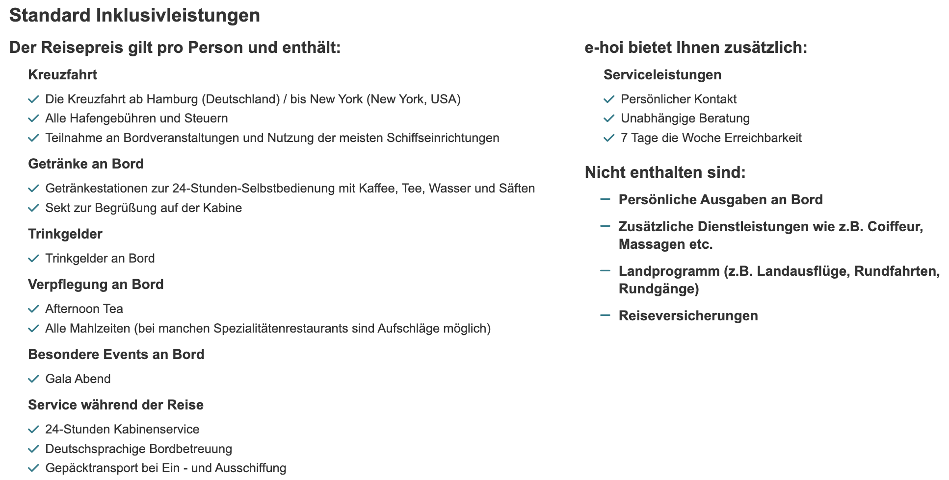 Bei e-hoi bekommt ihr gerade echt geniale Kreuzfahrt-Pakete inkl. der Rückflüge und der Transfers vom Hafen zum Flughafen. 🙌 In unserem Beispiel kostet das Paket mit den Rückflügen von New York und Vollpension etc. sogar weniger als nur die Kreuzfahrt ohne den Flug!
