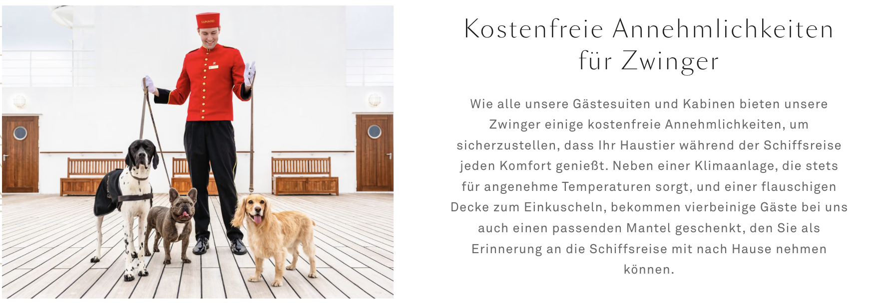 🐕 Spannend: Auf den Cunard-Schiffen könnt ihr sogar euren Vierbeiner mitnehmen. Dieser wird dann von einem speziellen Concierge während der Überfahrt versorgt (Für den Rückflug gelten gesonderte Regeln).