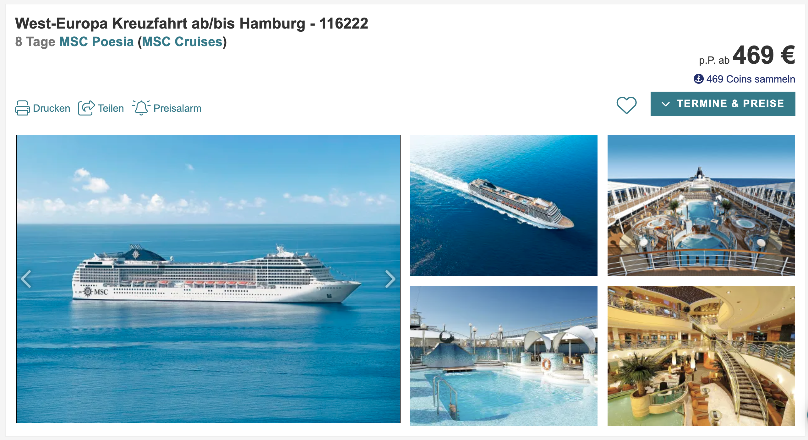Ahoi Piraten, wenn ihr im Januar noch nichts vorhabt, können wir euch diese schöne Westeuropa-Kreuzfahrt ab Hamburg auf der MSC Poesia empfehlen: Die sieben Übernachtungen mit Vollpension kosten euch derzeit nur 469 Euro pro Person. Ganz besonders empfehlen wir euch aber, mal einen Blick auf die Aufpreise für die Balkonkabine zu werfen, die gibt's nämlich auch schon für 519 Euro pro Person!