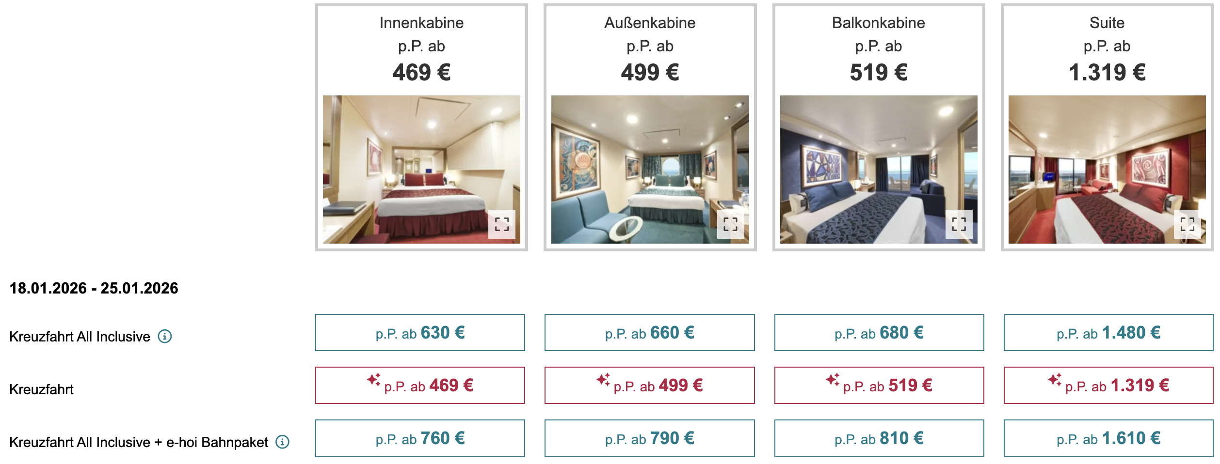 Hier die Aufpreise für höherwertige Kabinentypen: