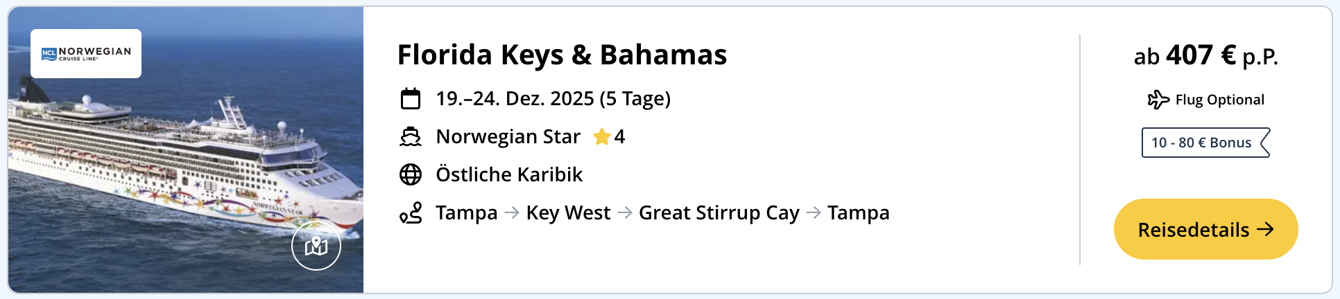 Meine Highlights sind die 5-tägige Cruise ab Tampa, Florida zu Weihnachten nach Key West für knapp 400 € oder die Cruises mit der nahezu nagelneuen Norwegian Viva ab Texas. 🤠