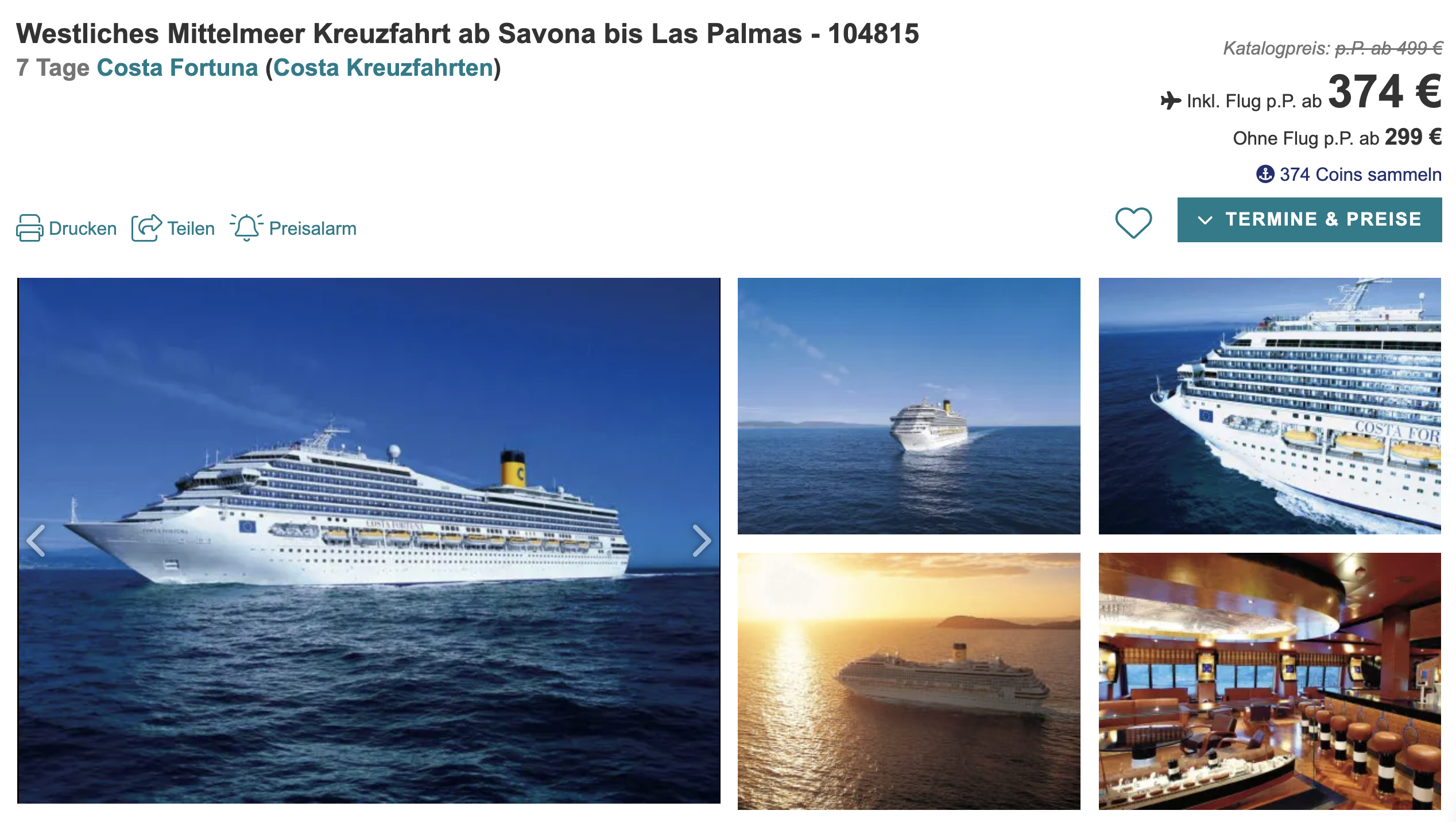Am 13.12. beendet die Costa Fortuna ihre Mittelmeersaison für dieses Jahr und fährt als Positionierungsfahrt rüber zu den Kanaren. Diese Tour hat vor einigen Wochen noch 499 Euro ohne Flüge gekostet und jetzt gerade ist sie für sagenhafte 374 Euro mit Flügen zu haben (Preis pro Person, wenn ihr zu zweit reist)! Selbst der Zug zum Flug (und zurück) ist im Preis schon mit drin.