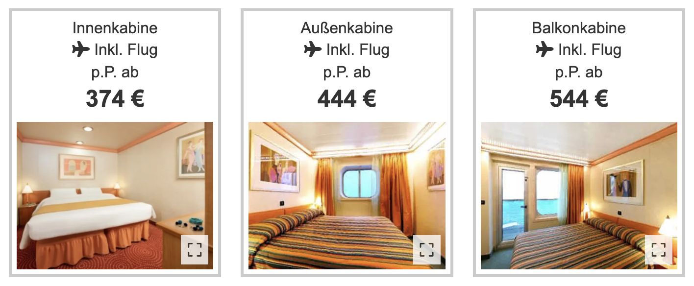 💡 Tipp: Auch Außen- und Balkonkabinen sind für kleine Aufpreise buchbar.