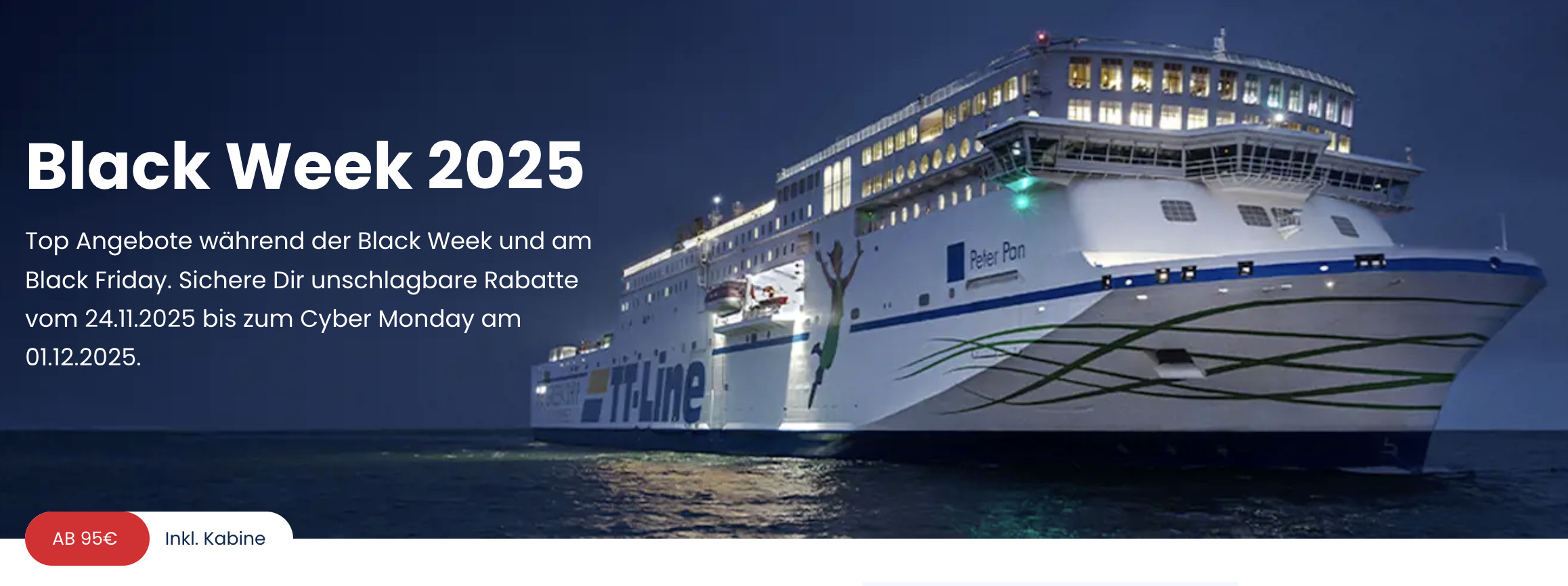 Pünktlich zur Black Week gibt’s bei den Fährüberfahrten mit der Schwedenfähre nach Trelleborg richtig starke Preise: Schon ab 95€ reist ihr mit bis zu 4 Personen, Innenkabine und Auto inklusive – perfekt für einen Roadtrip durchs schöne Südschweden! Ob Nebensaison oder Sommerferien: Der Deal ist richtig stark, und nur bis 1.12. verfügbar. 🚢💙 Einen Rabatt-Code braucht ihr auch nicht, einfach eure Kabine im Buchungsdialog auswählen und los geht's! 🎉