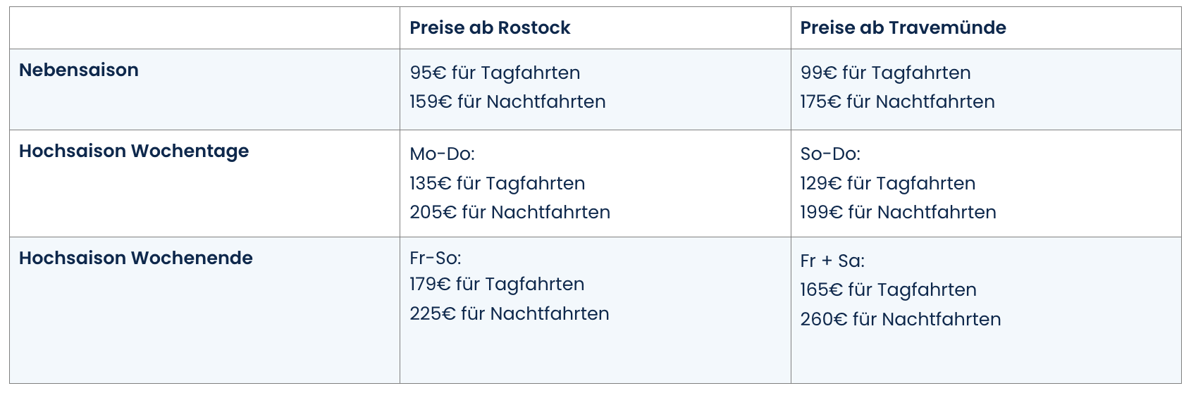 Hochsaison (Wochenende): 30€/Tag oder 50€/Nacht