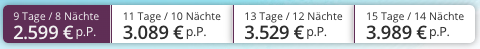 Wir haben das Angebot mit anderen Reiseveranstaltern geprüft, dabei haben wir das günstigste Angebot für genau dieselben Leistungen (im gleichen Reisezeitraum) ab 3.451,00€ gefunden. Mit diesem Deal zahlst du lediglich 2.549,00€ - bedeutet eine Ersparnis von 902,00€ pro Person, bzw. 1.804,00€ bei einer klassischen Reise zu zweit: