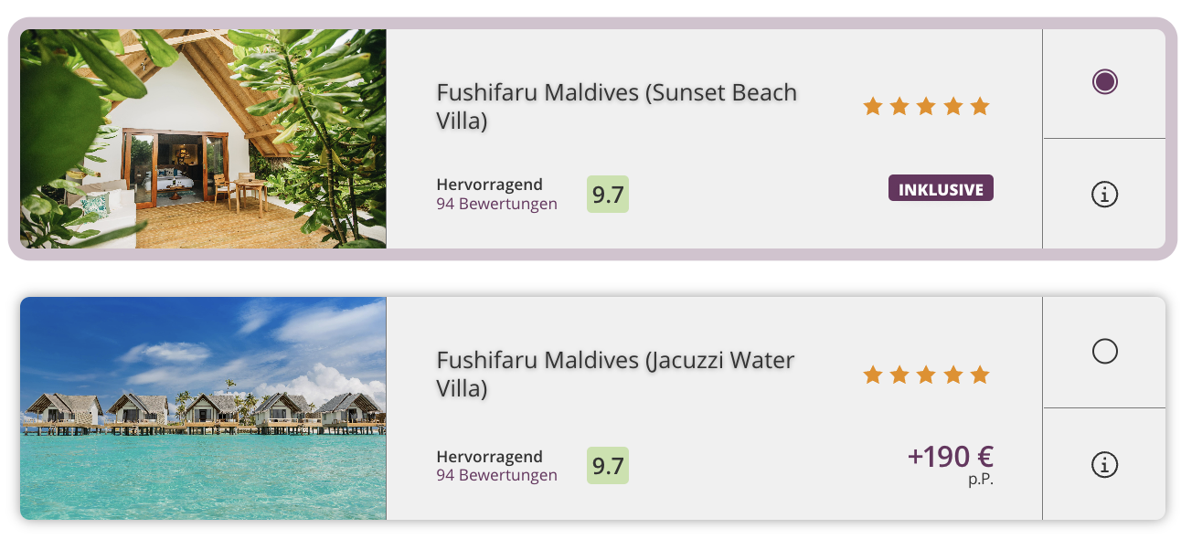 Natürlich ist auch ein Upgrade des kompletten Aufenthalts ab insgesamt 210 € p.P. möglich. Die Änderungen nehmt ihr ganz unkompliziert im Buchungsverlauf vor.