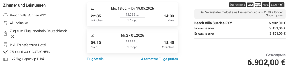 💥 Dieses Angebost kannst du mit 8, 10, 12 oder 14 Nächten inklusive Flügen, Transfer per Wasserflugzeug, der All-Inclusive Verpflegung und Schnorchelausflug ab 2.549€ pro Person buchen. Wir haben mal den Preis mit anderen Reiseanbietern verglichen und haben den günstigsten Preis woanders ab 3.451€ p.P. gefunden... Heißt, mit diesem Deal sparst du über 900€ pro Person 🤯.