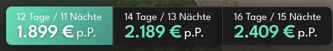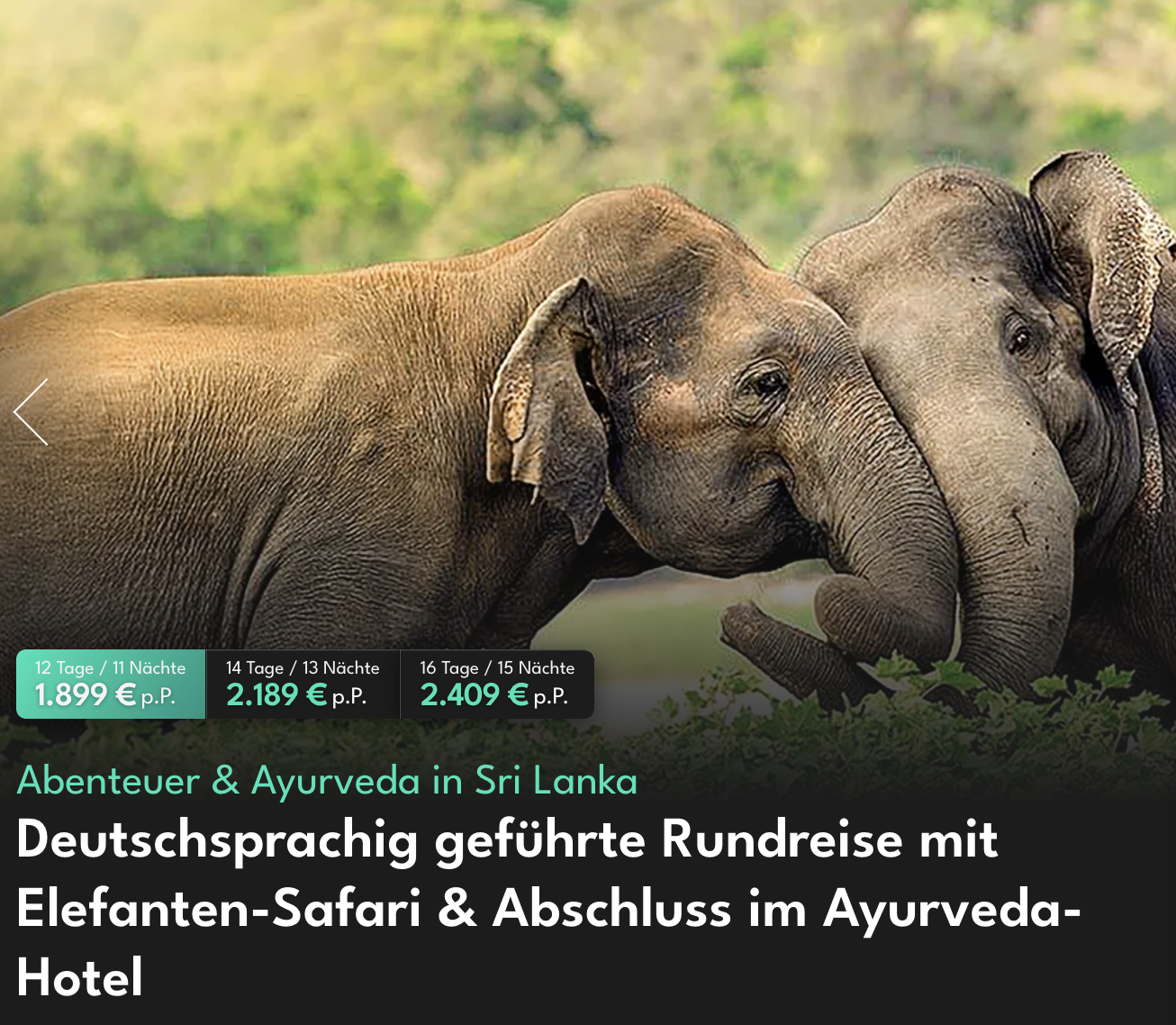 ✈️ Diese Reise kannst du entweder als 10-, 12- oder 14-nächtige Variante buchen. Dabei reist du bei jeder Variante für 7 Nächte durch Sri Lanka, jedoch kannst du den Aufenthalt im Ayurveda-Hotel verlängern, desto mehr Nächte du buchst.