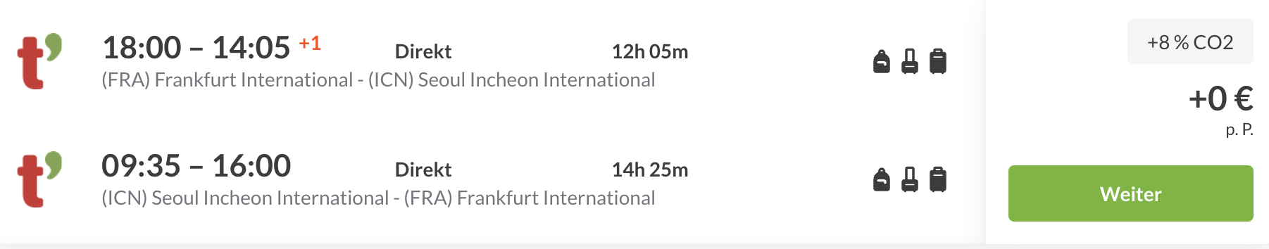 Am günstigsten bringt euch T'Way Air nonstop von Frankfurt am Main nach Seoul, wir verlinken euch aber auch günstige Optionen ab München, Düsseldorf, Berlin & Hamburg.