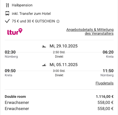 Dann könnte der folgende Deal für euch ziemlich interessant sein, denn es geht noch dieses Jahr im Oktober nach Kreta 🏝 - 1 Woche im 4* Hotel in Strandnähe, mit Halbpension sowie Flügen & Transfers gibt's aktuell für nur 558 Euro pro Person! 🔥.