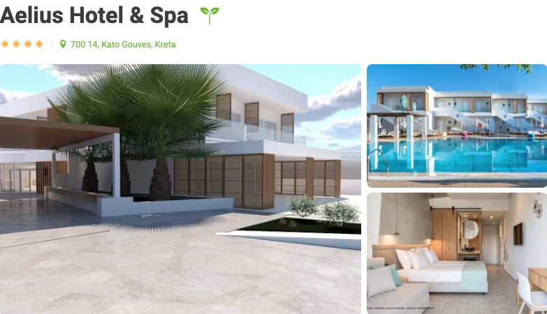 Das Aelius Hotel & Spa besteht aus den Bereichen Aelius und Sensus und befindet sich im Norden der Insel, etwa 17km östlich vom Flughafen Heraklion. Bis zum Strand sind es vom Hotels aus nur ca. 600 Meter, die nächsten Tavernen und Einkaufsmöglichkeiten findet ihr in der Umgebung.