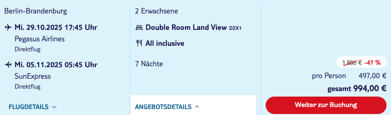 Alle hier genannten Reisepreise sind mit der Veröffentlichung des Deals verfügbar und buchbar, jedoch haben wir keinen Einfluss darauf, wann und wie stark sich ein Reisepreis verändern kann. Wenn die Nachfrage besonders hoch ist, kann der Flugpreis sich besonders schnell verändern und Unterkünfte ausgebucht werden.