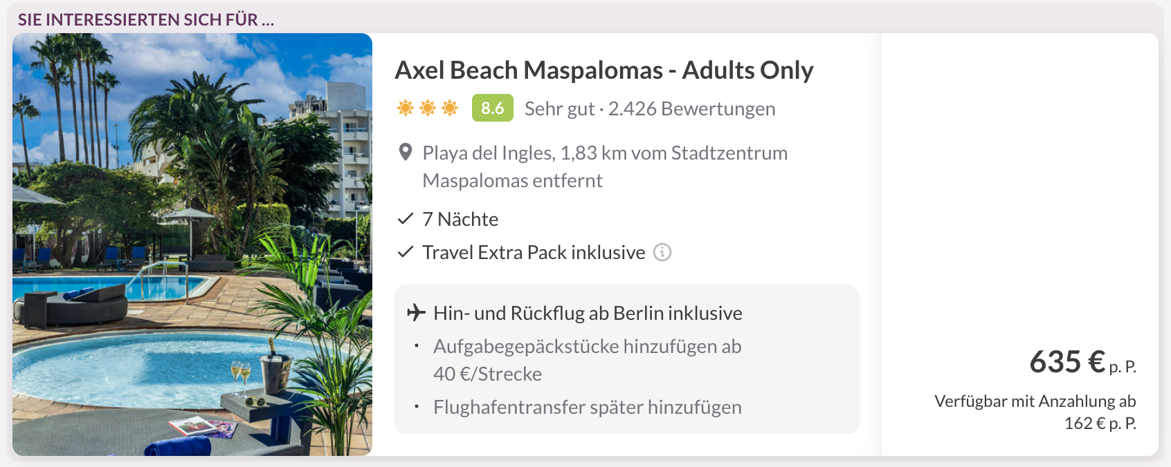 👉 Unser Deal: Im sonnigen Kanarenwinter könnt ihr 7 Nächte im Axel Beach Maspalomas verbringen, inkl. Flügen & Transfer seid ihr bei 662 Euro pro Person dabei. Optional zeigen wir euch noch Reiseoptionen mit Mietwagen sowie für Alleinreisende. 🏳️⚧️ 🏳️🌈