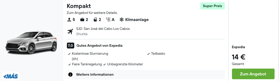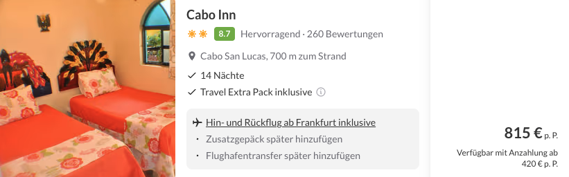 Pauschalreise: 815 Euro + Mietwagen: 7 Euro = 822 Euro pro Person