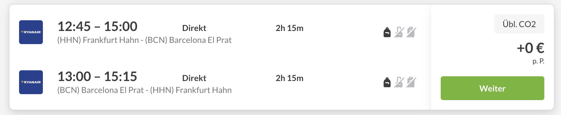 ℹ️ Bei fast allen Fluggesellschaften ist standardmäßig nur noch ein kleines Handgepäckstück inkludiert. In der Flugauswahl seht ihr das inkludierte Gepäck, weiteres Gepäck könnt ihr im Buchungsprozess dazubuchen.