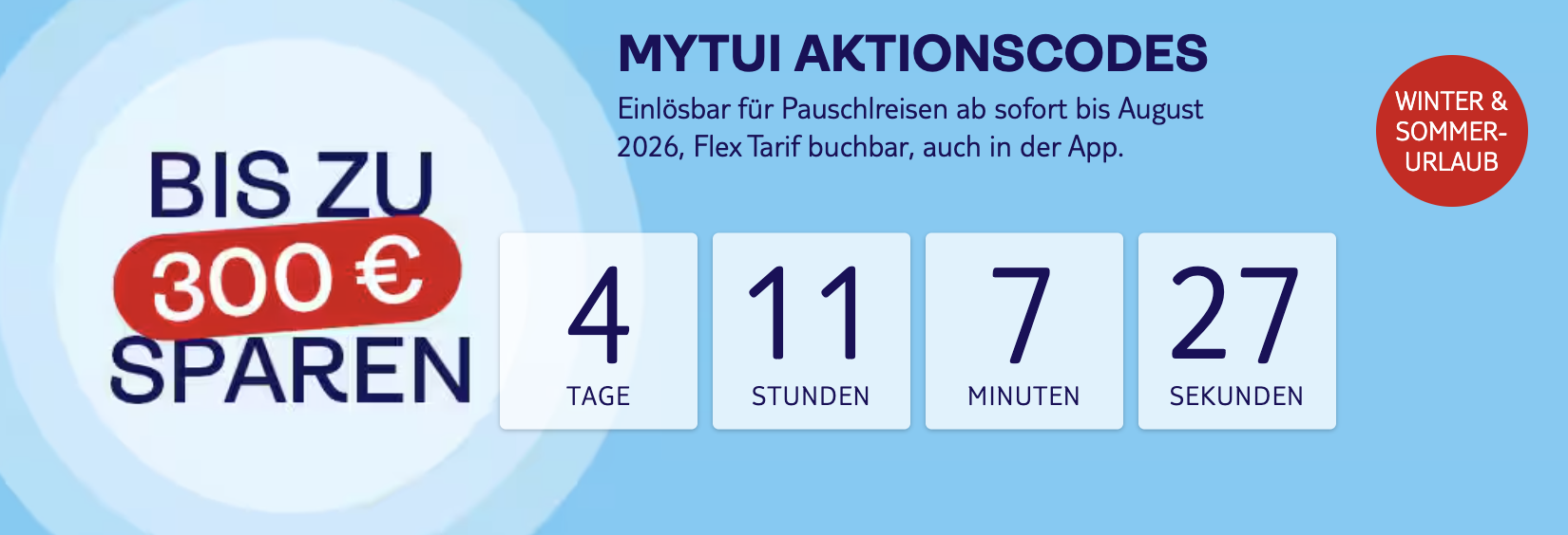 TUI Deutschland haut dazu passend einen Gutscheincode raus, mit dem ihr bei Buchung bis zum 28. Oktober 2025 bis zu 300 Euro pro Buchung auf ausgewählte Angebote weltweit.