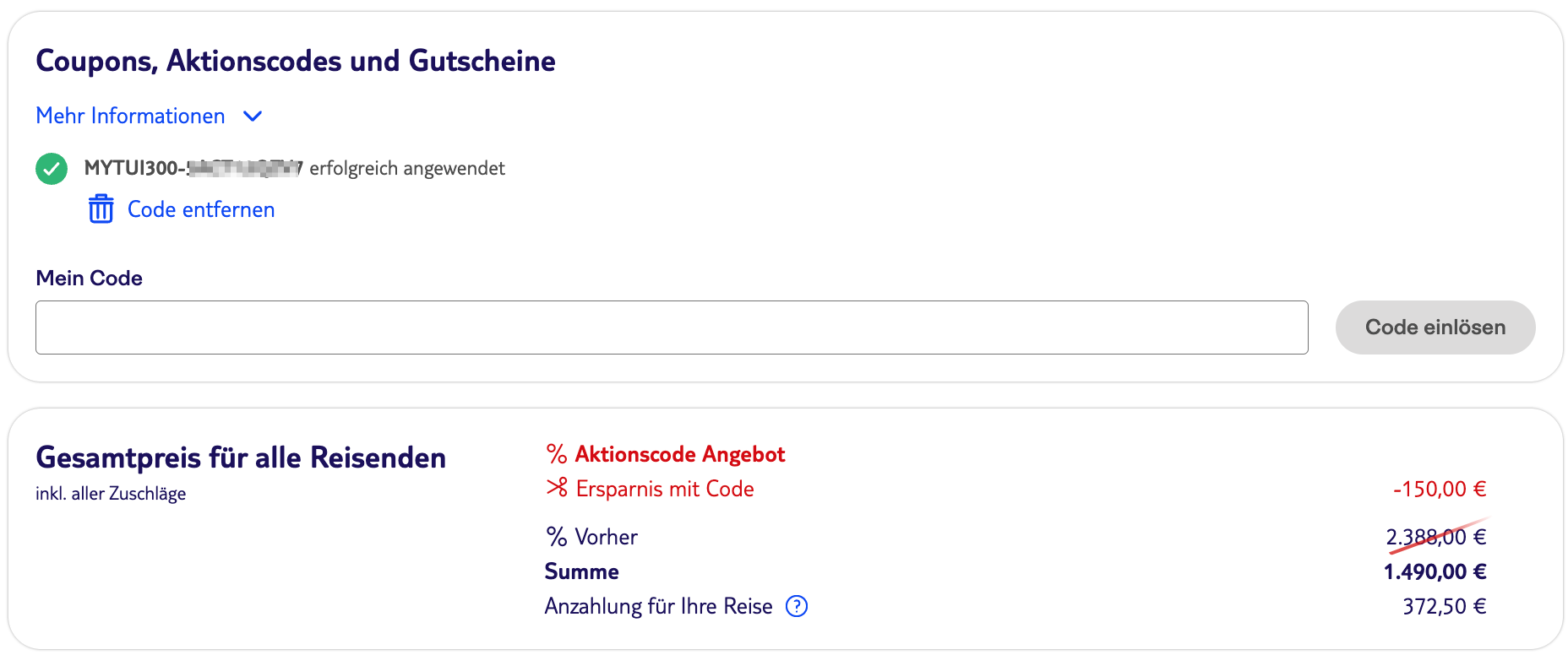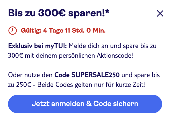 Meldet ihr euch bei der TUI an, erhaltet ihr einen personalisierten 300€ Gutscheincode. Andernfalls erhaltet ihr mit dem oben genannten Code bis zu 250€ Rabatt.