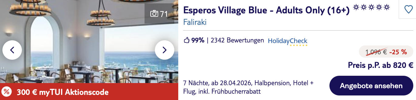 Somit könnt ihr euch für euren nächsten Urlaub mal etwas mehr gönnen, wie zum Beispiel das 5-Sterne-Luxushotel "Esperos Village Blue - Adults Only" auf Rhodos zum Beginn der Badesaison 2026 ab 745€ statt 820€ pro Person erhaltet! Mit Anmeldung zum TUI-Newsletter sind es sogar die vollen 300€ Rabatt