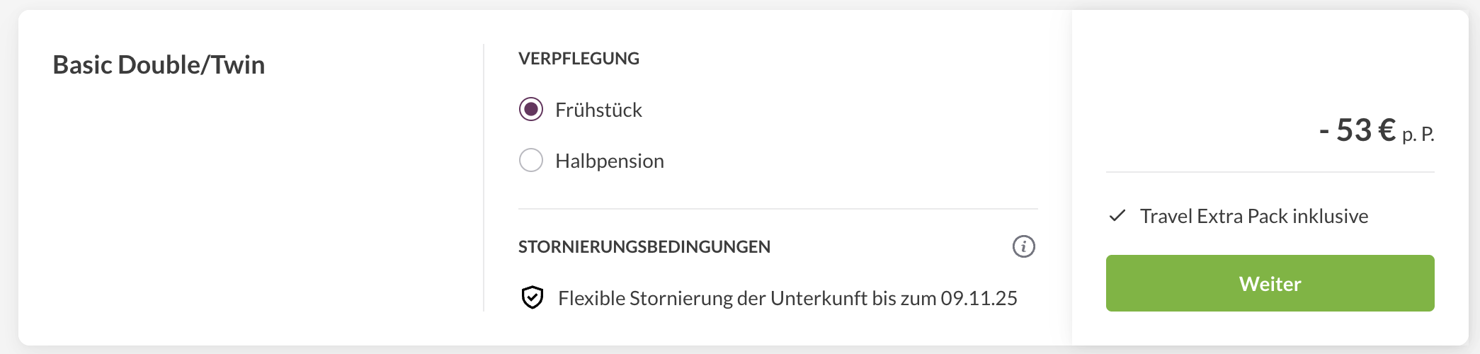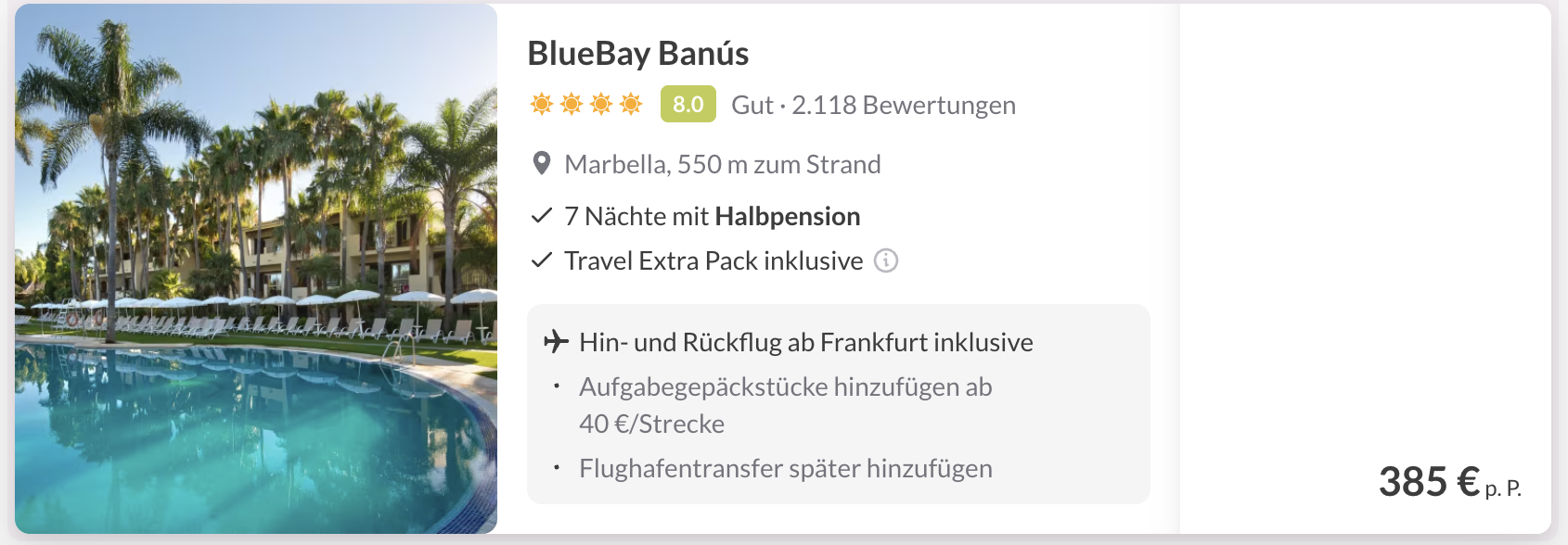 Euch reicht Frühstück? Dann könnt ihr noch mal 53€ p.P. sparen und würdet dann nur 332€ zahlen.