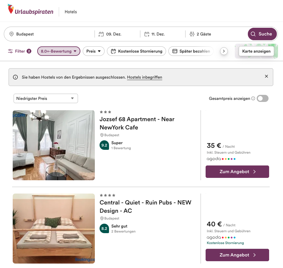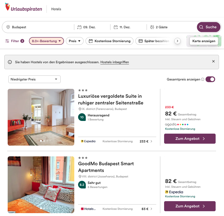 Bei den angebotenen Unterkünften geht es bereits ab 41€ pro Person los bei der Reise zu zweit. Klickt euch einfach mal durch die Suchergebnisse und schaut, welche Unterkunft für euch gut passt. Wir haben bereits Hostels deaktiviert und nur Unterkünfte mit einer Bewertung von mindestens 8.0 Punkten in die Suche einbezogen. Ansonsten könnt ihr aber anhand der vielen Filtern die für euch passende Unterkunft finden. Wir möchten mit diesem Deal lediglich zeigen, wie günstig es möglich ist.