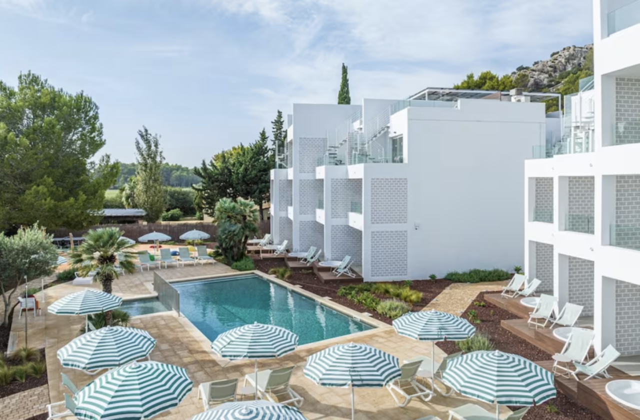 Zum Komplex gehört außerdem ein Außenbereich mit Sonnenliegen und zwei Außenpools.