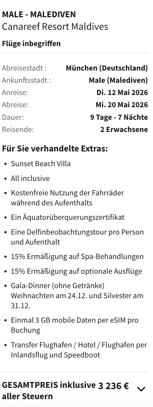 Wie immer haben wir die Preise verglichen und geschaut, was ihr woanders zahlt. Und auch hier ist die Ersparnis echt guuuut. Bei weg.de zahlt ihr im Beispielzeitraum für dasselbe Zimmer 3.730€. Bei Voyage Privé hingegen zahlt ihr gerade mal 3.236€ und bekommt noch ein paar Extras on top. Somit spart ihr hier einfach ÜBER 494€, was fast 250€ pro Person entspricht! 😎