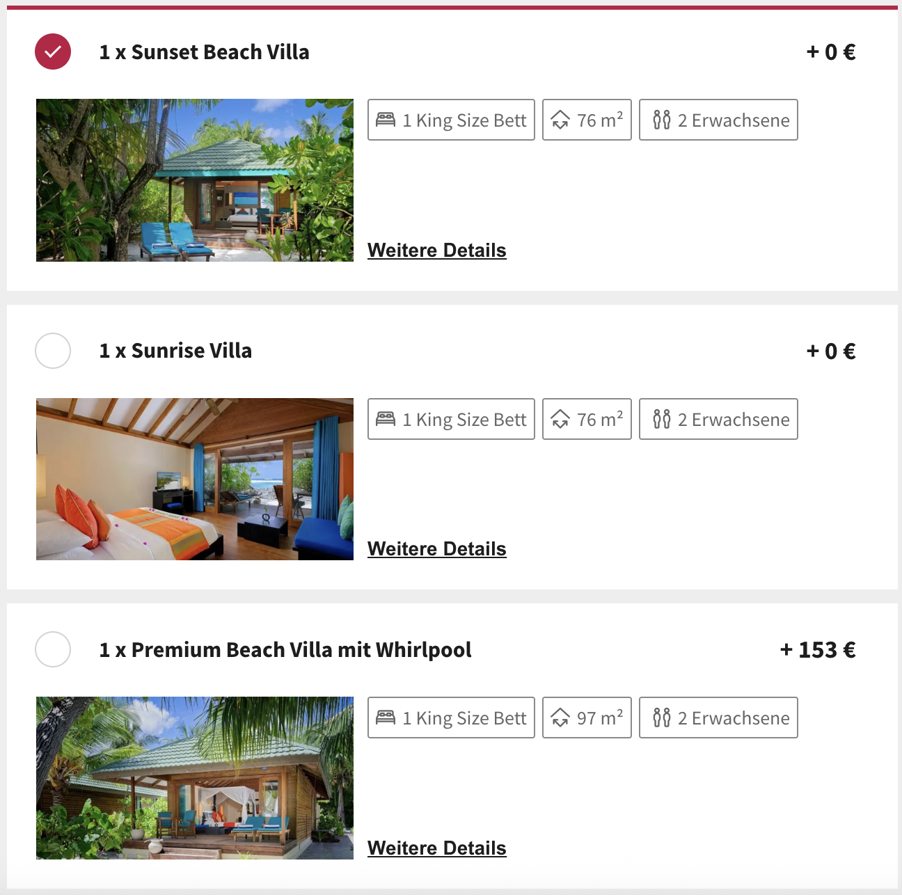 Im Buchungsprozess könnt ihr zwischen der Sunset Beach und der Sunrise Villa wählen, ohne einen Aufpreis zu zahlen. Möchtet ihr aber doch noch etwas mehr Luxus in eurem Urlaub könnt ihr für nur 76€ p.P. auf eine Villa mit Whirlpool upgraden.
