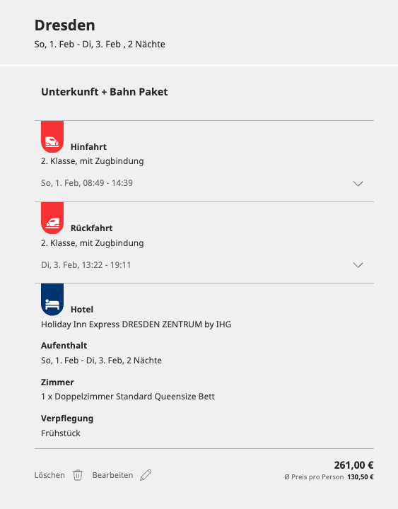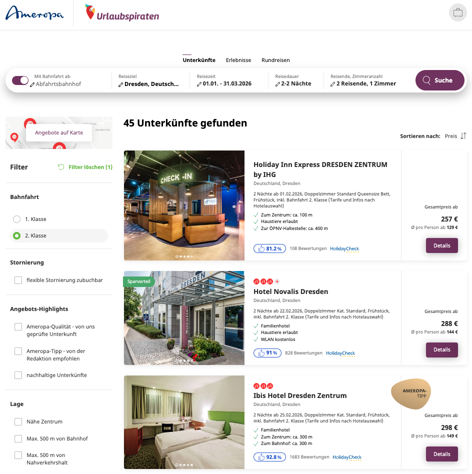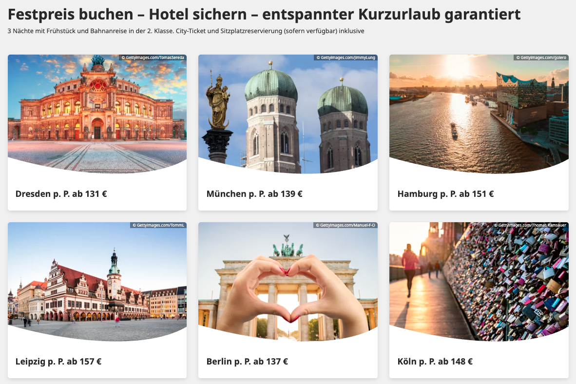 Neben zwei Übernachtungen inklusive Frühstück habt ihr zudem noch die Hin- und Rückfahrt mit dem Zug in der 2. Klasse sowie die Sitzplatzreservierung (sofern verfügbar) enthalten. Besonders cool: Bei diesem Deal gibt es die Bahnfahrt zum Festpreis. Das heißt, dass ihr jede beliebige Verbindung wählen könnt, von jedem Bahnhof deutschlandweit, zu jeder Tageszeit, ganz ohne Aufpreis!