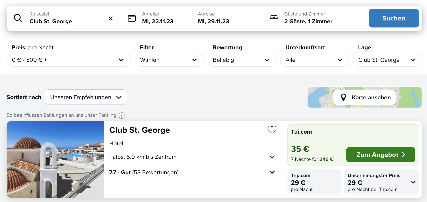 Trivago ist eine Preissuchmaschine und vergleicht alle Preise auf dem Markt, daher kann es sein, dass euch ein anderer Preis bzw. auch ein anderer Veranstalter angezeigt wird, nachdem ihr euch weiterleiten lassen habt. Denn überlegt mal, wie viele Zimmer ein Hotel zum günstigsten Preis hat und wie viel tausend User durch uns innerhalb von kurzer Zeit darauf zugreifen können bzw. buchen. Daher heißt der beste Tipp schnell sein, gerade wenn es sich um kleinere Hotels oder gar Ferienwohnungen handelt, die Ruck Zuck ausgebucht sind.