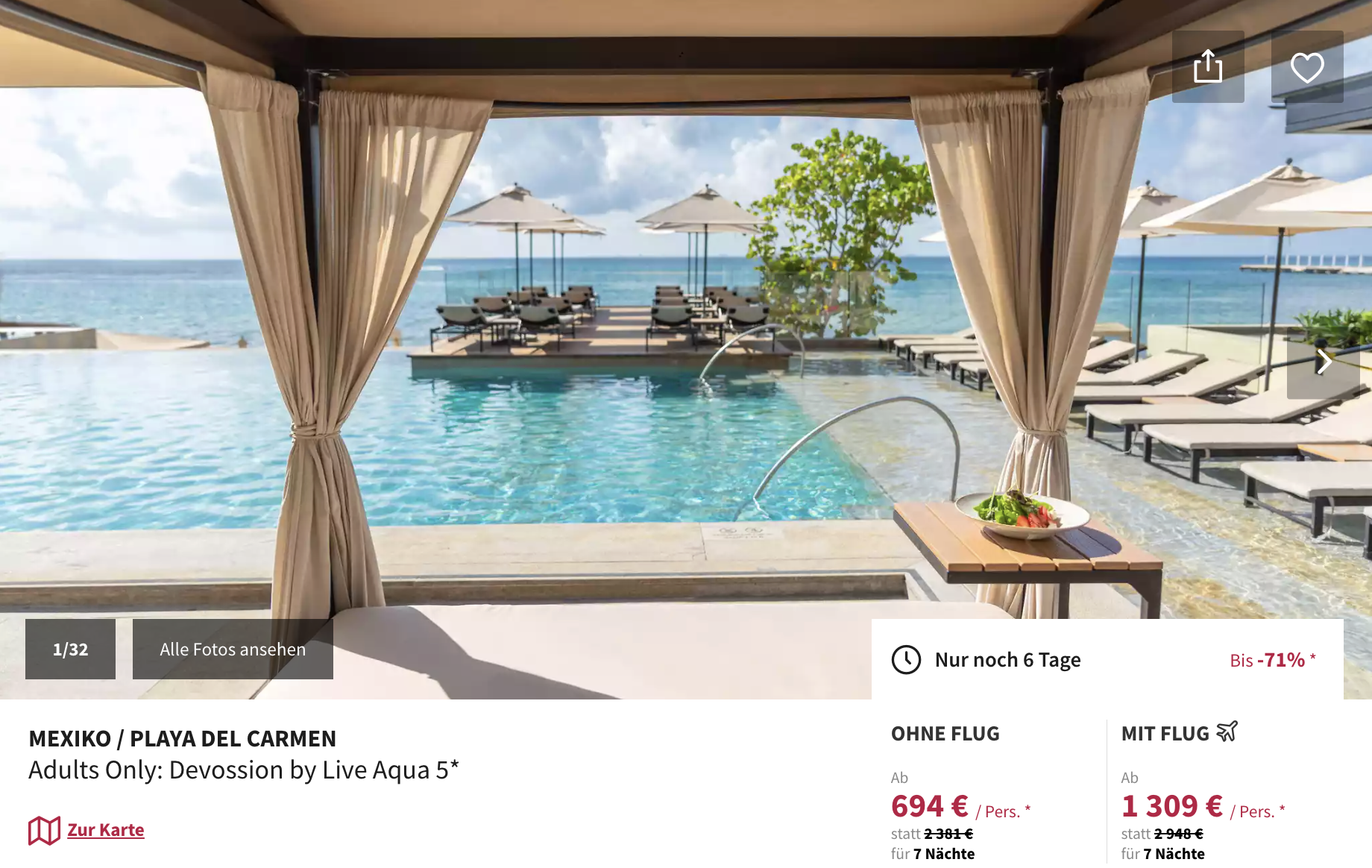 Da Voyage Privé zum Teil Verträge mit den Hotelbetreibern hat, nach denen sie die Preise nicht öffentlich bewerben dürfen, müsst ihr euch dort erst einen (kostenlosen und unverbindlichen) Account anlegen (also mit eurer E-Mail-Adresse registrieren), um auf das Angebot zugreifen zu können.
