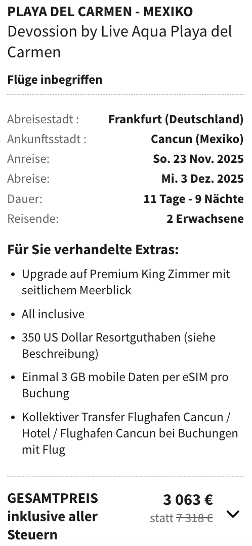 Dann checkt diesen Deal unbedingt aus, denn hier gibt es wirklich alles was ihr für einen unvergesslichen Urlaub im Tropenparadies direkt am Strand von Playa del Carmen ab 1.531€ pro Person: