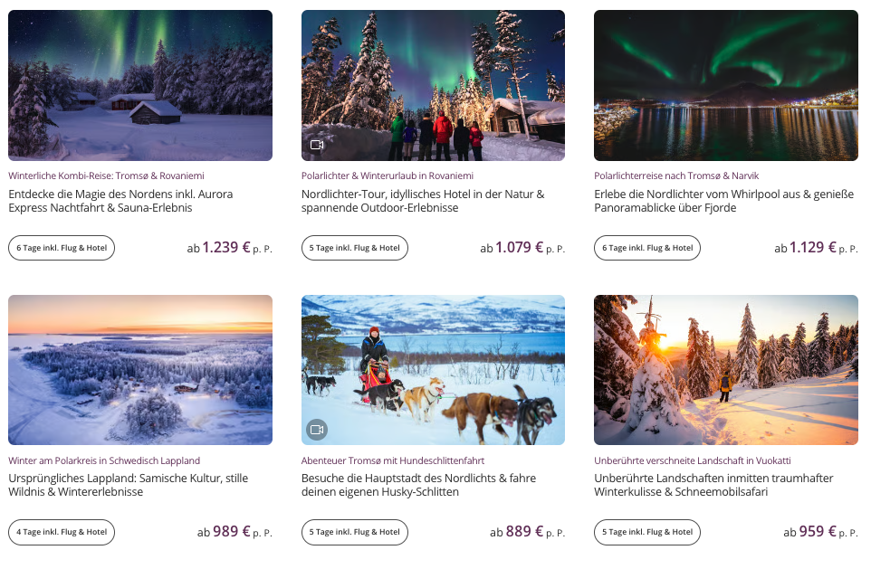 P.S. Alle hier abgebildeten Reisen sind mit dem Gutscheincode UP-LAPPLAND-60 mit 60 € Rabatt buchbar! Der Gutscheincode ist bis zum 23. November gültig.