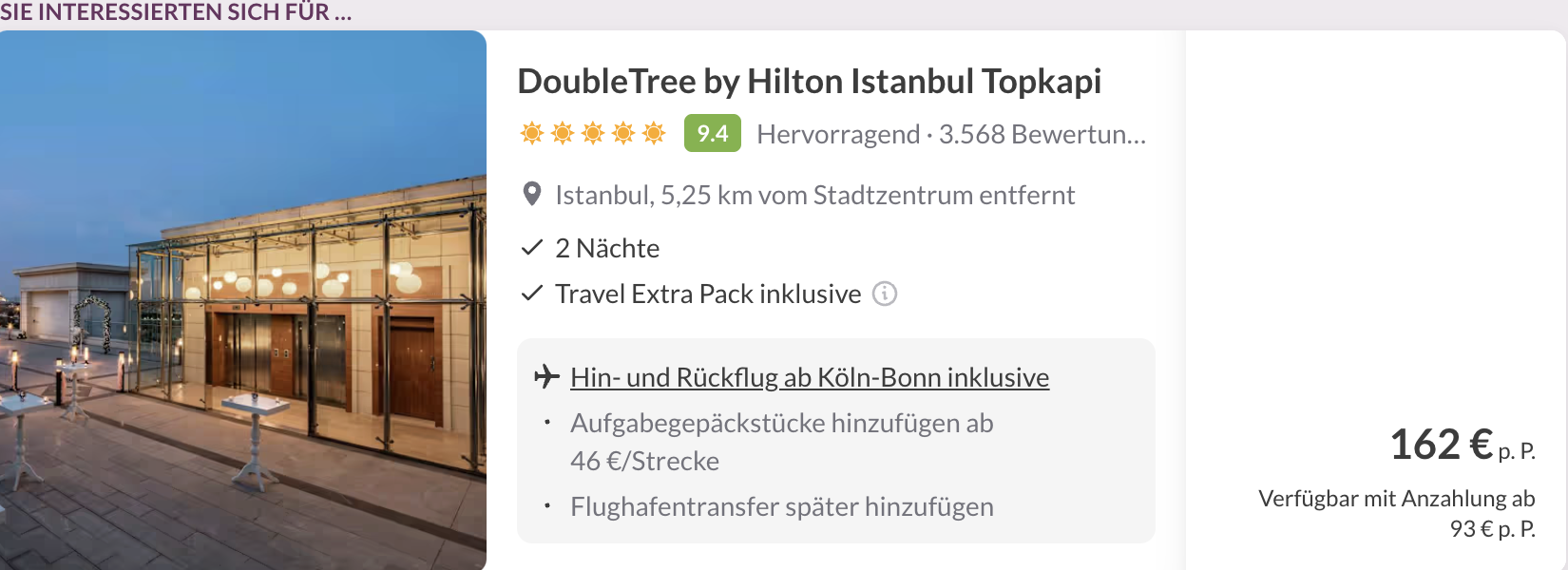 im Moment gibt es super preiswerte Flüge nach Istanbul. Für gerade mal 162 € p.P. bekommt ihr Flüge ab z.B. Köln und 2 Nächte im zentralen 5 * Double Tree by Hilton Hotel in Istanbul! Lasst euch einfach mal weiterleiten und schaut euch an, wie krass das Hotel aussieht! Für 29 € extra p.P. bekommt ihr sogar noch 2x Frühstück dazu oder ihr bucht direkt eine Nacht länger für nur 45 € p.P.