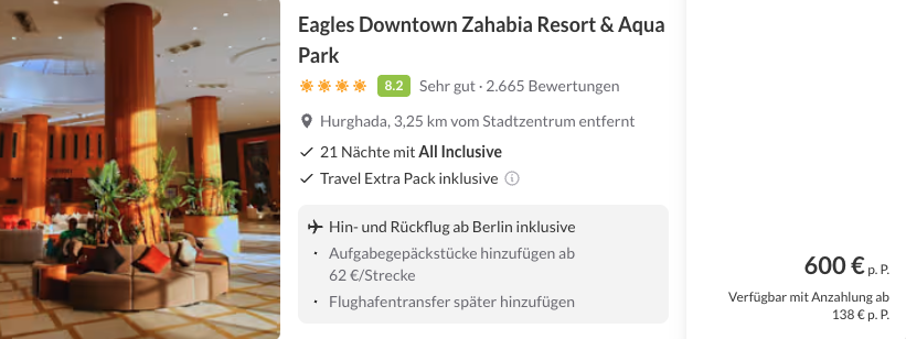 3 Wochen Ägypten im 4* Resort inkl. Direktflügen und ALL INCLUSIVE ab Berlin bekommt ihr für gerade mal 600 € p.P. Das Hotel hat sogar noch einen eigenen Aquapark! Das Resort liegt nur 20 Minuten vom Flughafen entfernt.