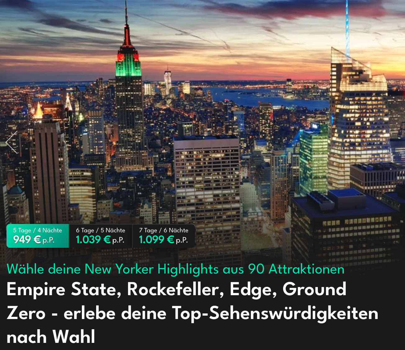 So kannst du während deiner Zeit vor Ort jeden Tag eine oder mehrere Attraktionen besichtigen 🗽. Die Flüge (mit Aufgabegepäck), sowie gut bewertete Hotels sind natürlich im Preis mit enthalten.