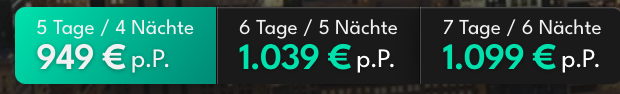 💤 Du kannst diese Reise in verschiedenen Längen buchen, und zwar mit 4, 5 oder 6 Nächten Aufenthalt. Auf dem Rückweg legst Du noch eine weitere Nacht im Flieger ein.