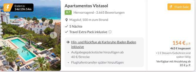 Alle hier genannten Reisepreise sind mit der Veröffentlichung des Deals verfügbar und buchbar, jedoch haben wir keinen Einfluss darauf, wann und wie stark sich ein Reisepreis verändern kann. Wenn die Nachfrage besonders hoch ist, kann der Flugpreis sich besonders schnell verändern und Unterkünfte ausgebucht werden.