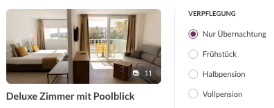 Deluxe Zimmer (mit Kochnische) oder gegen Mini-Aufpreis auch mit vollausgestatteter Küche (Premium Apartment) oder mit Meerblick buchbar. Ebenfalls optional buchbar: Verpflegung bis Vollpension